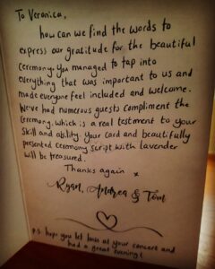 Where do I begin? The Heart-led Celebrants’ training has been so thorough, beautiful and inspiring! I’m so glad I chose to train with you – clearly the vibes were right. From your hospitality and beautiful food, to taking time out of your busy lives to critique my work (yes, those pesky video submissions!), the shadowing experiences, and your detailed, gorgeous books. I’m really looking forward to reading the Love Story book – not just because it’s the same name as my fave Taylor Swift song. So THANK YOU from the bottom of my heart for believing in me. Sophie
